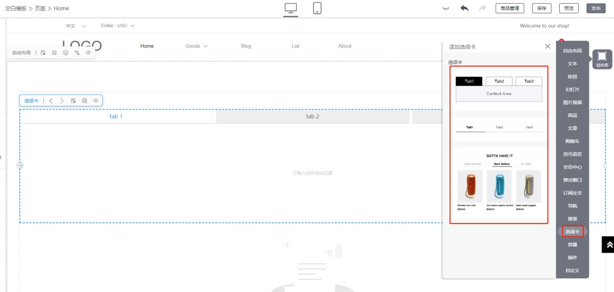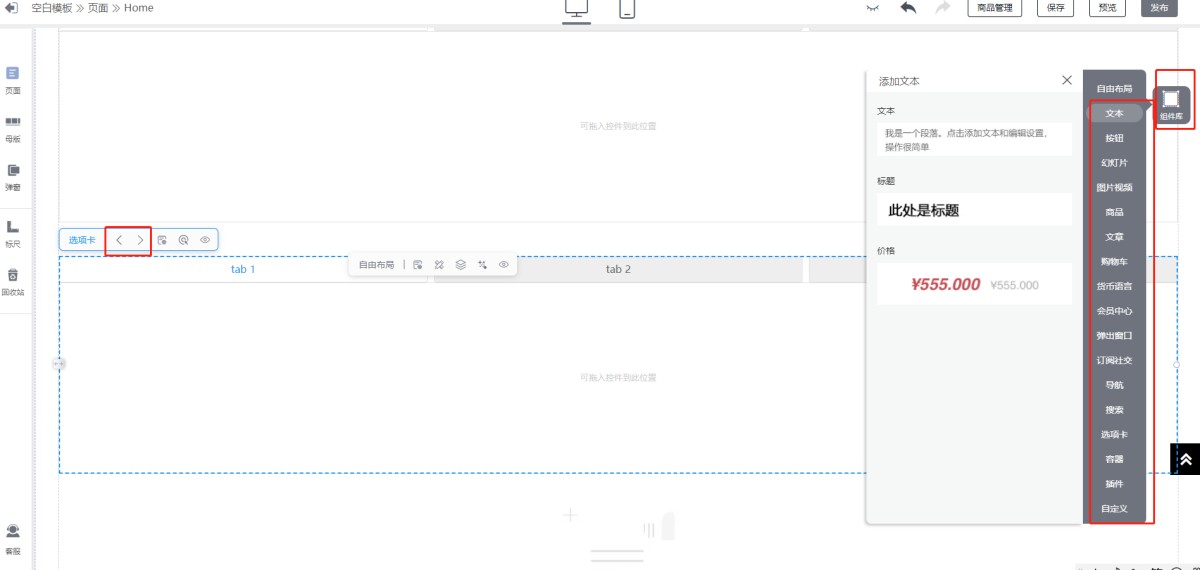 2.再在拖入的选项卡中插入相应的文本,文章,按钮等组件。可左右切换选项卡,编辑选项卡属性等。