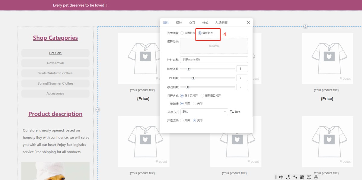 A: 在母版里设置商品列表时,需要在属性中确认选择【母版列表】而不是【普通列表】,如果选择【普通列表】,那导航选项下商品列表里的商品不会切换。步骤如下图:点击母版—商品列表—属性—选择母版列表