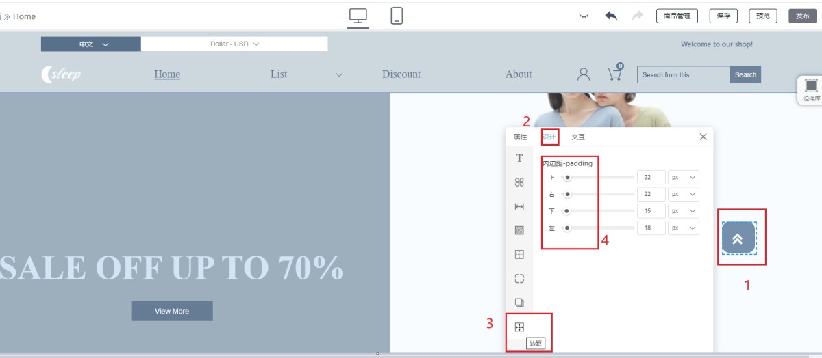 2)选中按钮组件,点击“设计”—“边距”,可以调节按钮上下左右的边距。
