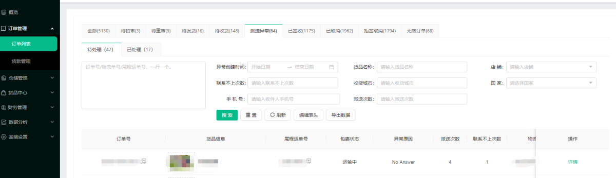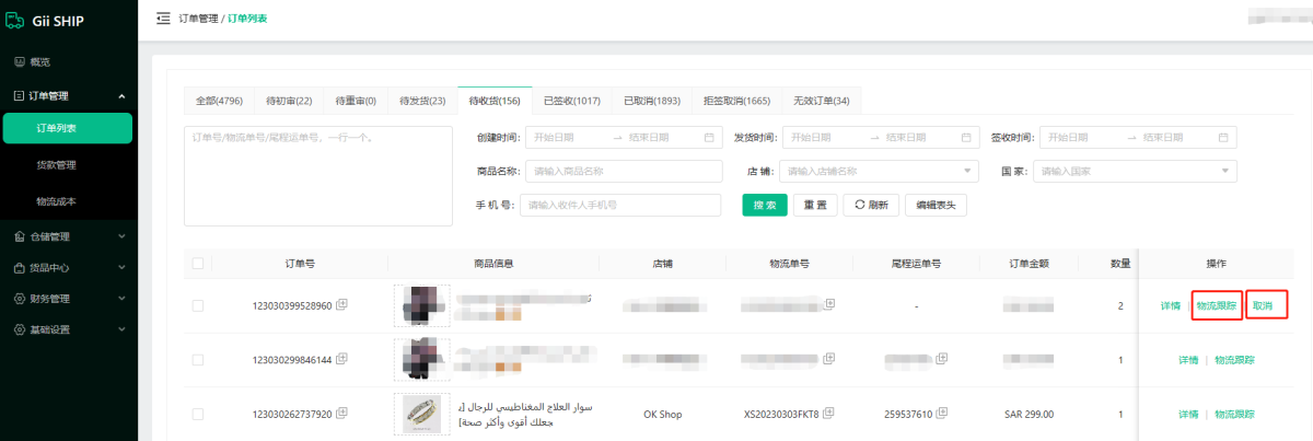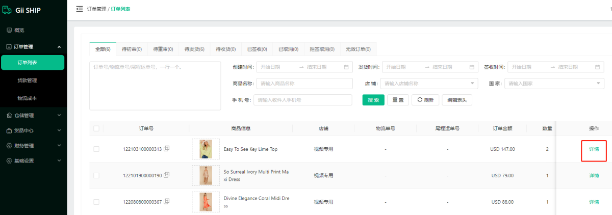 1).点击订单列表,可查看多个店铺全部的订单,待初审,待重审,待发货,派送失败,待收货,已签收,已取消,拒签等订单,无效订单(测试单或者重复单)。
