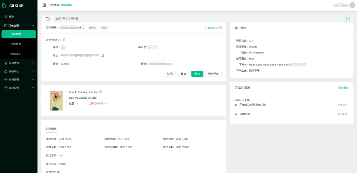 3).点击详情,查看订单的详情,复制买家下单时订单详情链接,可编辑收货地址,驳回或者审核通过订单,取消订单,查看商品信息,付款信息,修改订单价格,查看客户信息,分析客户来源,购买次数,查看订单时间线,添加备注。