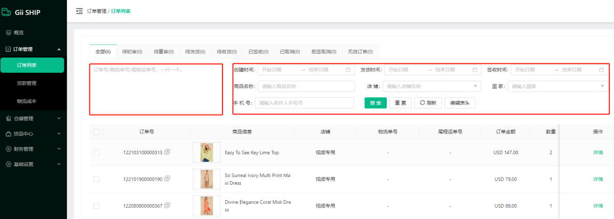 2). 批量搜索订单:批量输入订单和物流运单号和尾程,一行一个,可批量搜索订单,通过时间,商品名称,店铺名称,国家和手机号码搜索单个订单。
