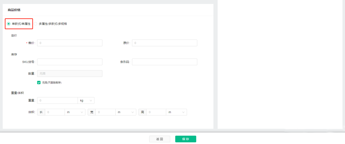 1) Single style/single attribute: Check the single style/single attribute, and directly fill in the basic information such as product price, original price, inventory, weight/volume, etc.