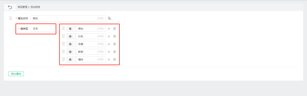A. A maximum of 5 product attributes can be added to each product, and a maximum of 20 attribute values can be added under each attribute. Product attributes can be dragged and adjusted arbitrarily, and the same attribute value cannot be added repeatedly. The property display can set three types of text, color and graphic. When selecting graphic as the display type, all attributes need to be accompanied by graphic.