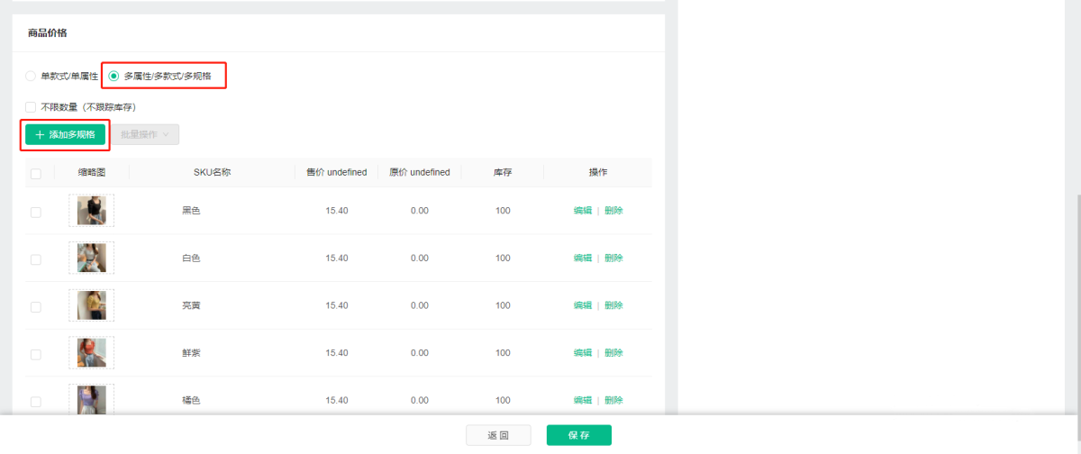 (2) "Batch operation of multi-specification products": When a product is added with multiple specifications, it can be operated in batches, and the price, inventory, weight, SKU number, barcode and length, width and height can be modified in batches.