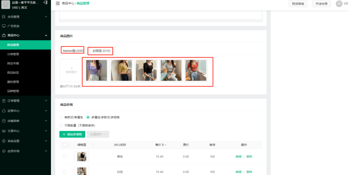 (2) You can choose to add a banner image and a cover image of the product. (The banner image is displayed on the product details page, and the cover image is displayed on the product list page). If the cover image is not uploaded, the first image in the Banner image will be the cover image by default. The first banner image is the main image of the product details, located on the home page of the product display interface (the store decoration can set the product details page to display the banner image or cover image). If you need to adjust the order of the product display images, you can drag and drop them. way to change the order of pictures;