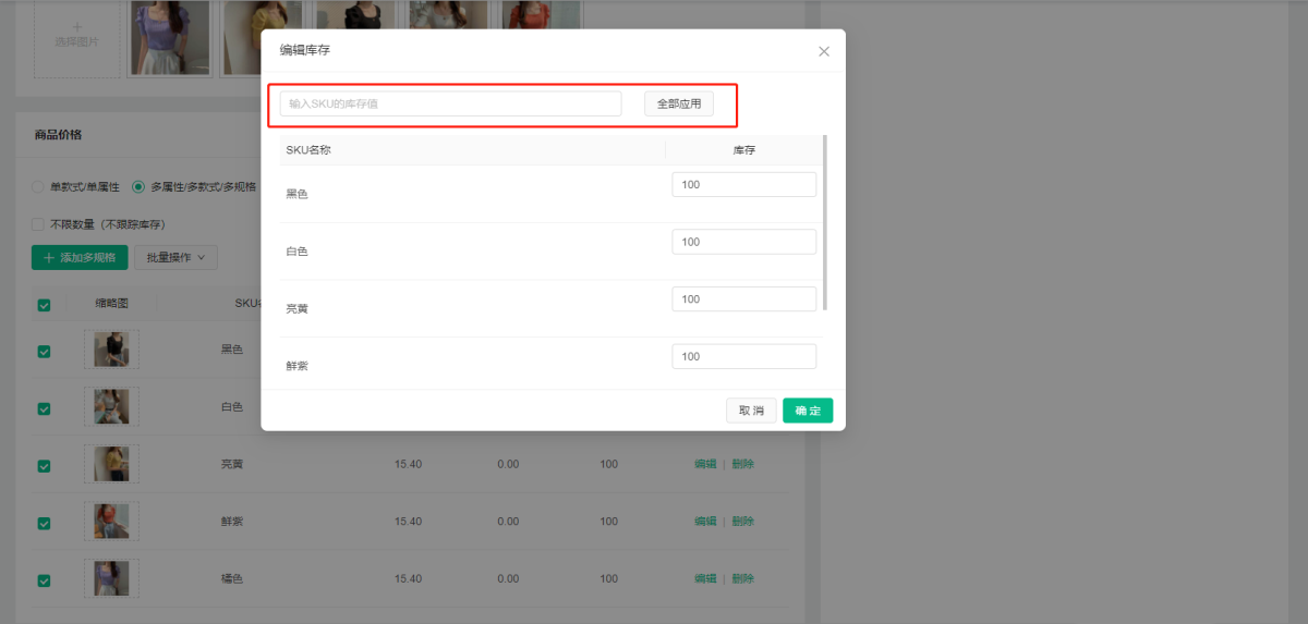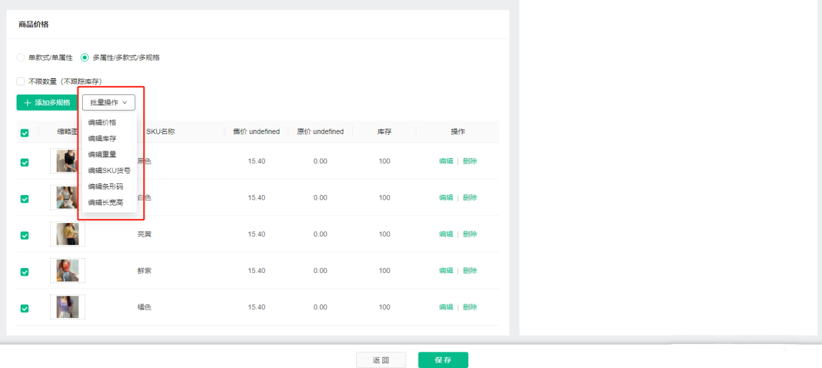 (2) "Batch operation of multi-specification products": When a product is added with multiple specifications, it can be operated in batches, and the price, inventory, weight, SKU number, barcode and length, width and height can be modified in batches.