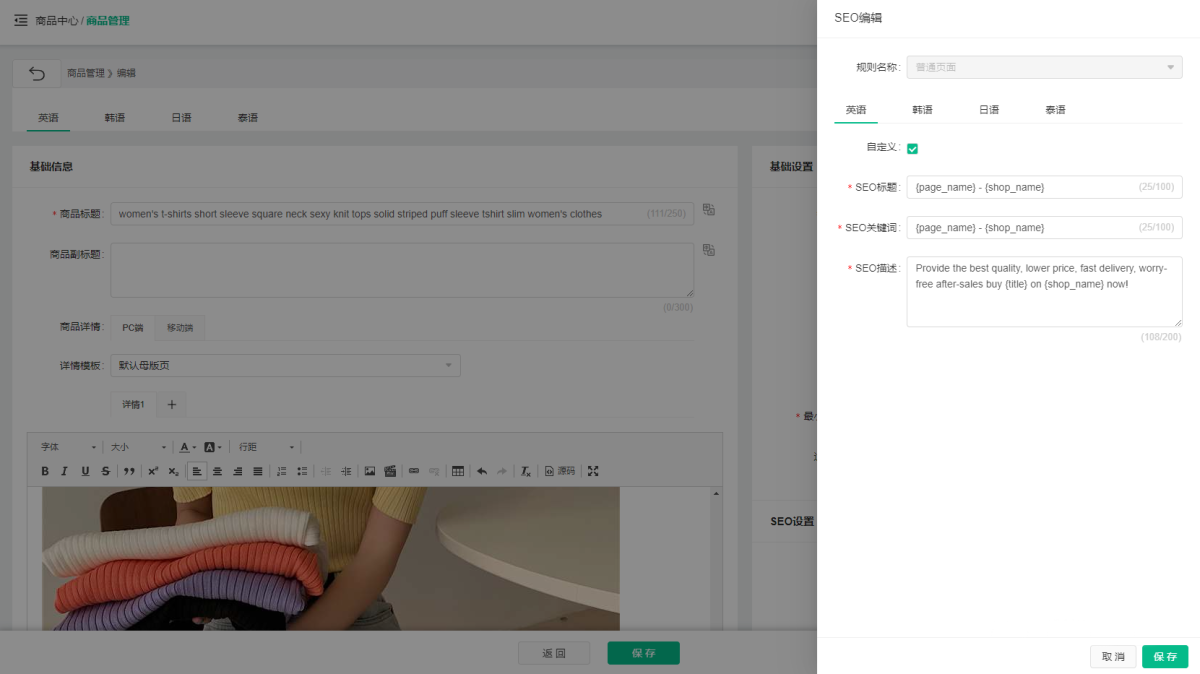(2) "SEO Settings": Click Edit, click Customize, and fill in the SEO information (SEO title, SEO description, SEO keywords, etc.) of the product, or you can use the system default SEO information.