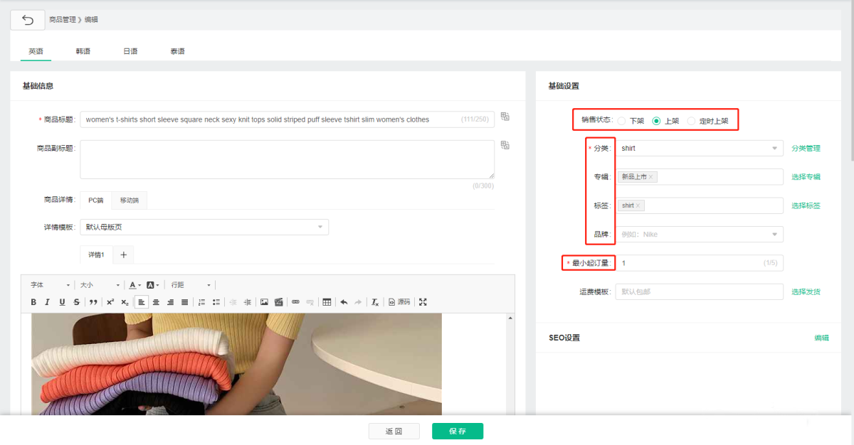 (1) "Basic Settings": You can set the product sales status, add product categories, albums, labels and brands and other information, set the minimum order quantity and shipping templates;