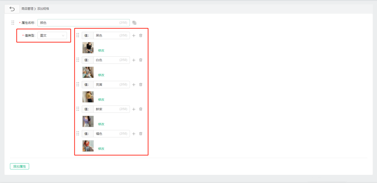 A. A maximum of 5 product attributes can be added to each product, and a maximum of 20 attribute values can be added under each attribute. Product attributes can be dragged and adjusted arbitrarily, and the same attribute value cannot be added repeatedly. The property display can set three types of text, color and graphic. When selecting graphic as the display type, all attributes need to be accompanied by graphic.