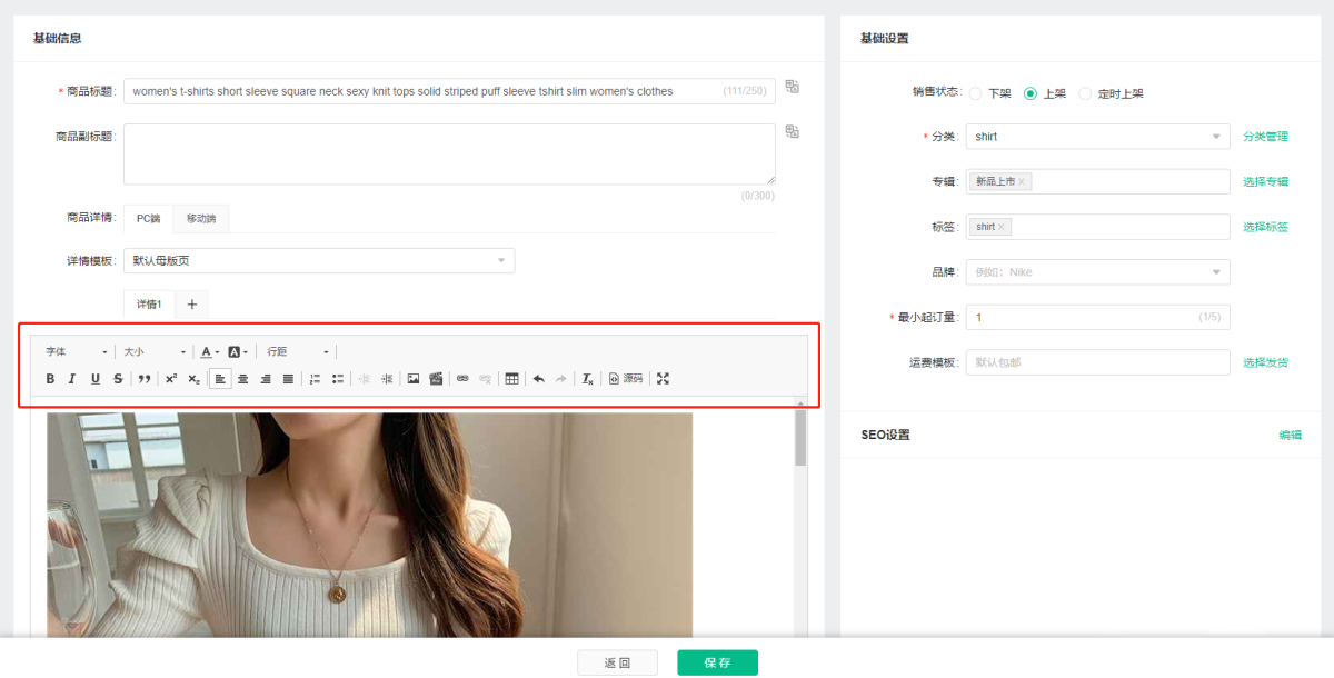 (4) Add product descriptions by editing or pasting information in the rich text box; the rich text box not only supports image and video uploading, text editing, but also supports diversified editing of pictures, and opens code editing functions.