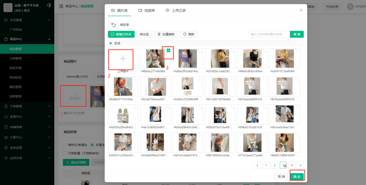 (1) "Product Picture": Click "Select Picture", "Upload Picture" to select the picture of the product locally and upload it to the resource library, then select the picture or drag the picture to the dotted box, and click OK. As shown below: