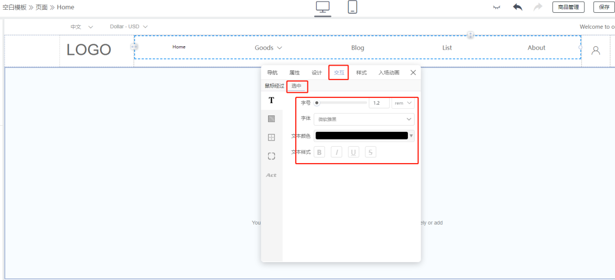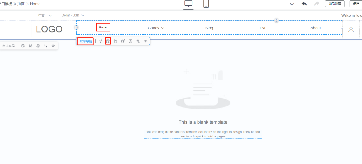 In the blank template, why can't the font style be edited for the "HOME" of the horizontal navigation?