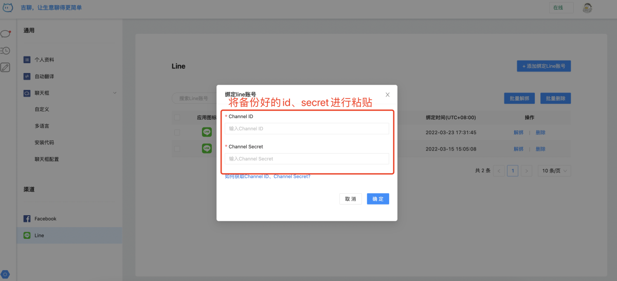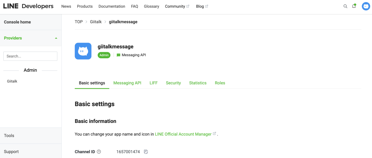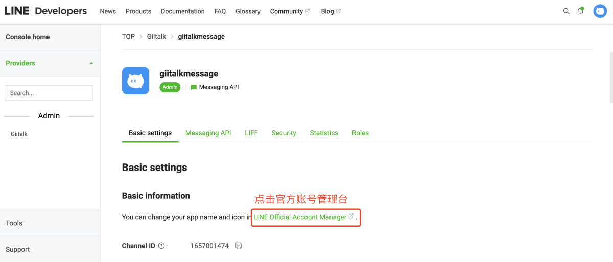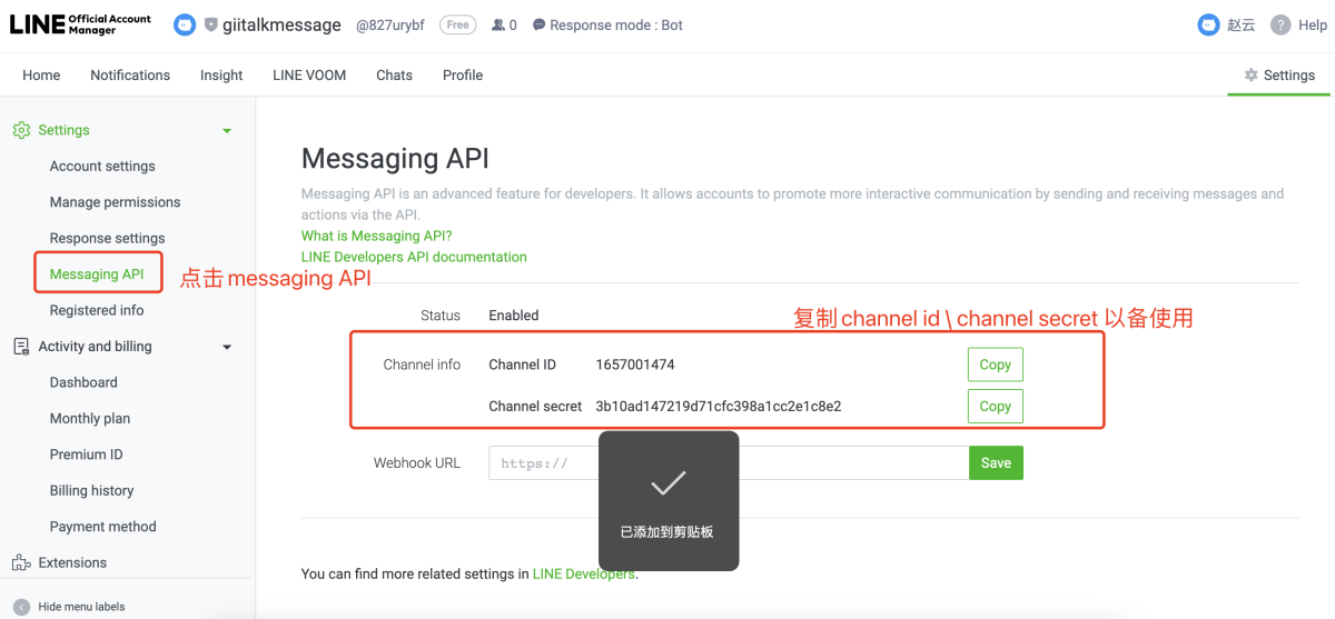 4.点击官方账号管理台,选择Messaging API ,复制Channel id 和Channel secret。