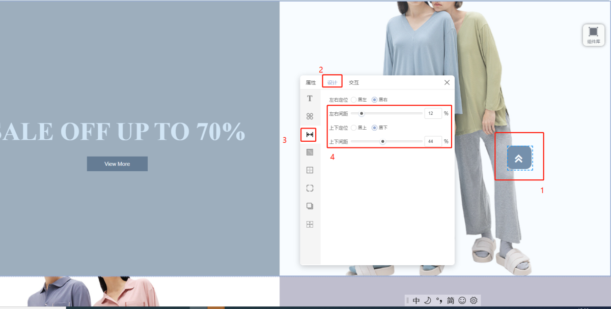 A:1) Return to the top component: select the button component, click "Design" - "Spacing", and adjust the "Left and Right Spacing" and "Top and Bottom Spacing". As shown.