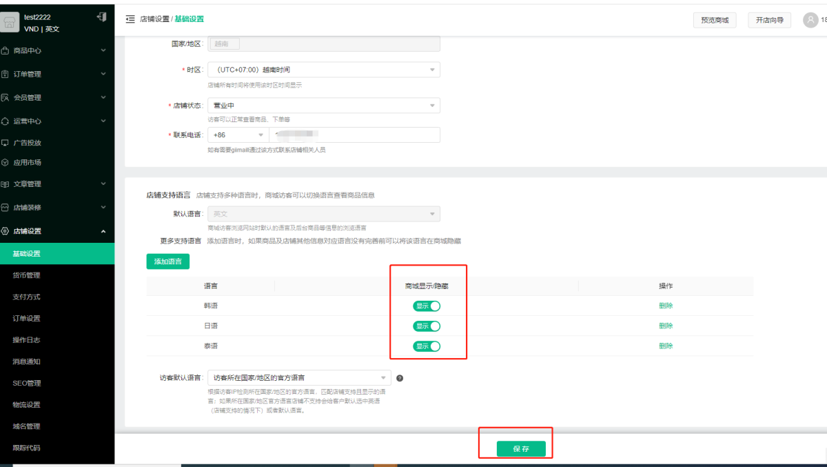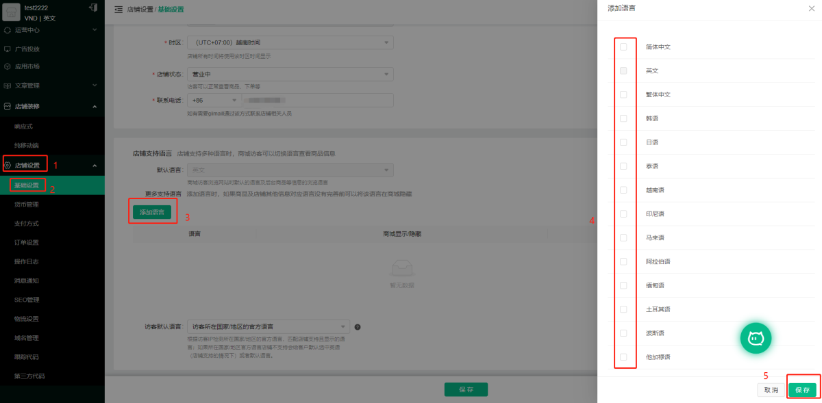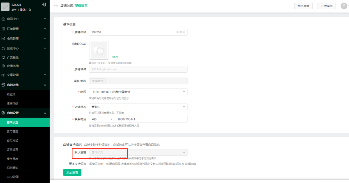 Click [Store Settings] - [Basic Settings], click [Add Language] under the supported languages of the store, select the target language (multiple choices), and click Save.