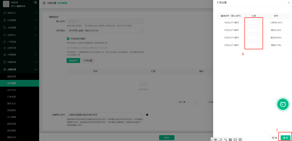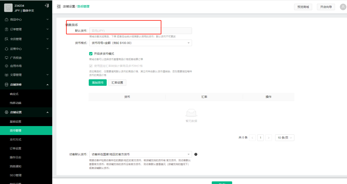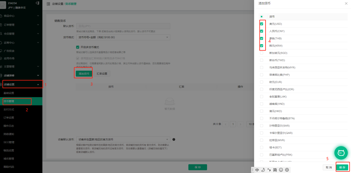 1) Add multiple currencies as follows: Click [Store Settings] - [Basic Settings] - [Currency Management] - [Add Currency] - Check the currency to be added - [Save] - Fill in the exchange rate - [Save].