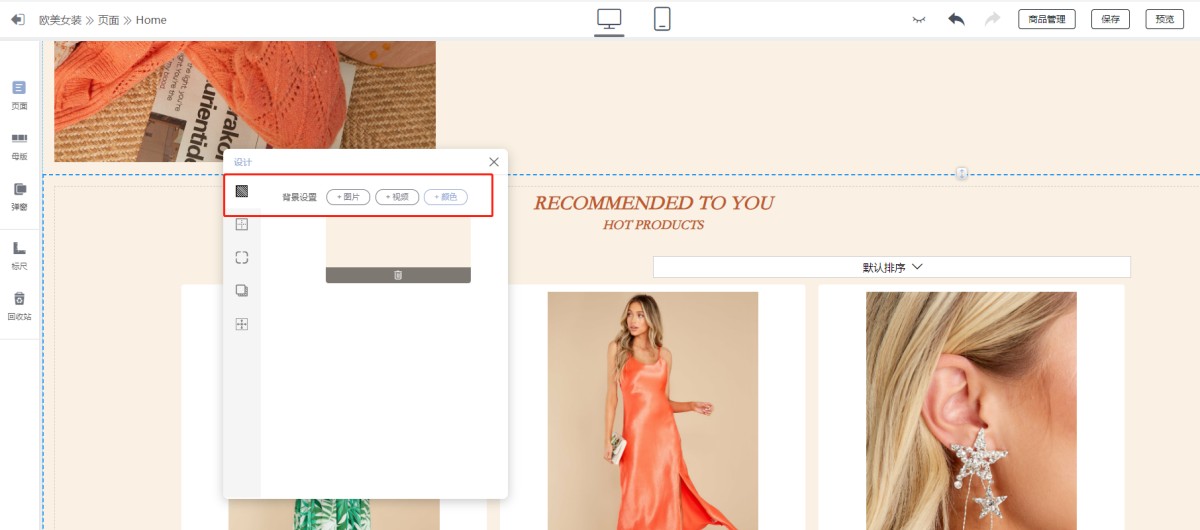 2. Set the background color of the page content: Click on the blank space of the page, the page content toolbar will appear, open the page content design panel, and in the background design, add or modify the page background color.