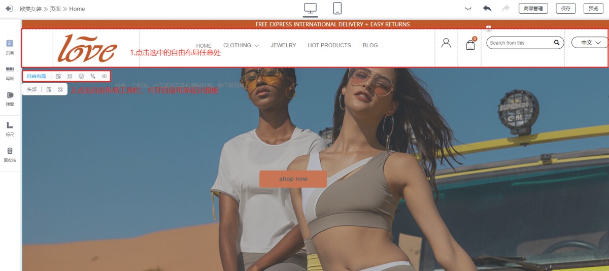 A: 1. Set the background color of the header or bottom: select Free Layout, click anywhere on Free Layout, the Free Layout Toolbar will appear, click on the Toolbar to open the setting panel.