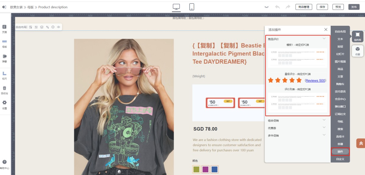 2.在商品评价插件中设置评价组件的样式,导入评价,审核及管理评价等,请点击参考商品评价操作指南。