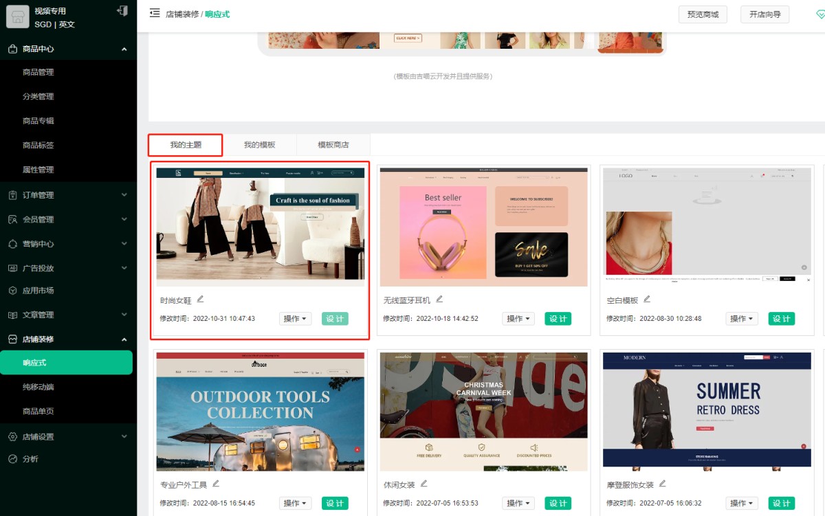 2. 在 我的主题 中点击选中的主题或者 设计 进入编辑页面装修店铺。