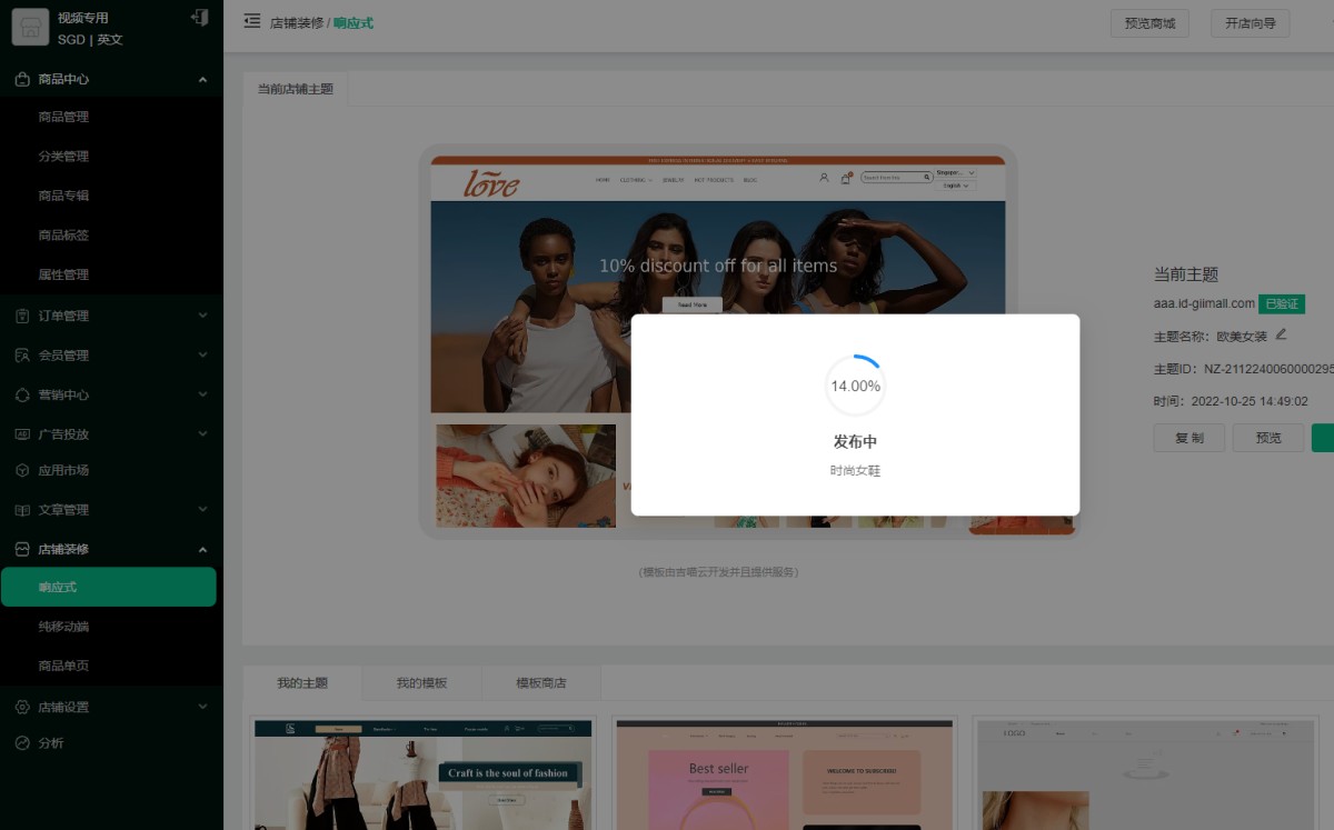 3.店铺装修完成以后,点击 发布, 即可绑定正式域名,发布该主题为当前主题。